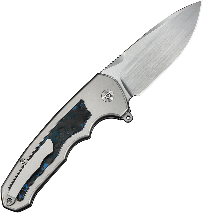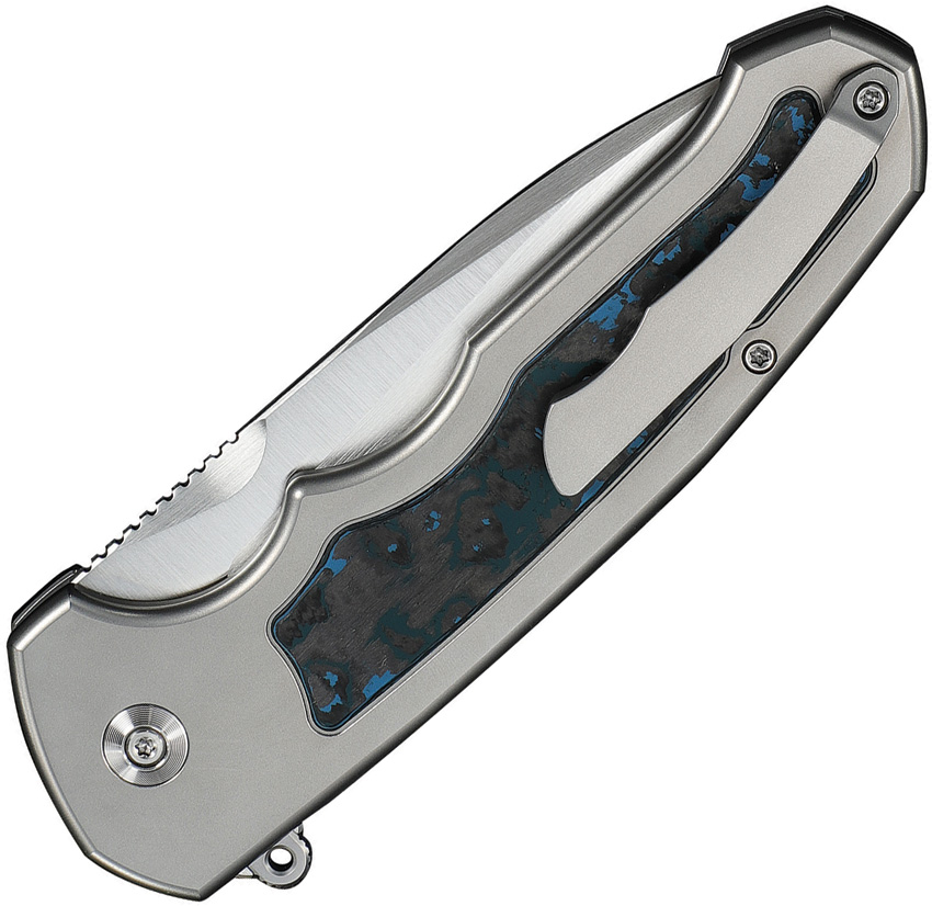 5.38″ (13.67cm) closed. 4″ (10.16cm) satin finish Bohler M390 stainless drop point blade. Gray titanium handle with Arctic Storm Fat carbon fiber inlay. Extended tang. Pocket clip. Black nylon zippered storage case. Boxed.
