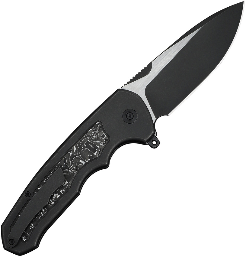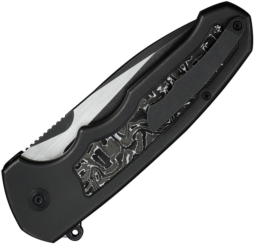 5.38″ (13.67cm) closed. 4″ (10.16cm) black stonewash and satin finish Bohler M390 stainless drop point blade. Black titanium handle with Aluminum foil carbon fiber inlay. Extended tang. Pocket clip. Black nylon zippered storage case. Boxed.