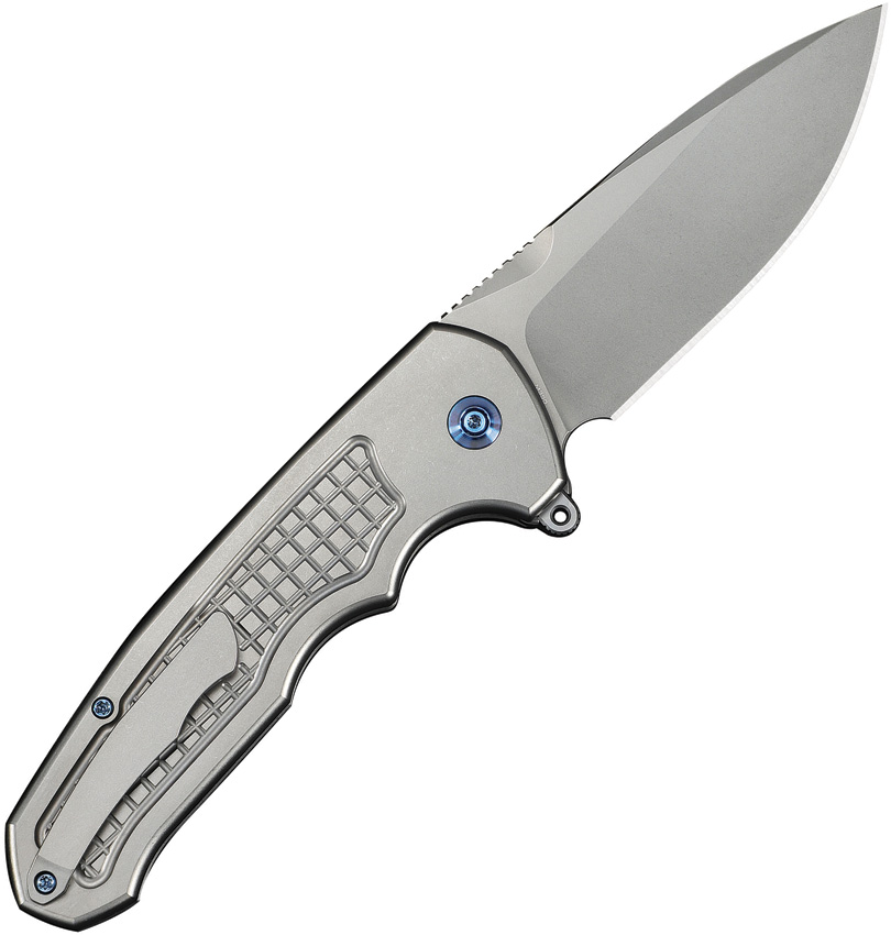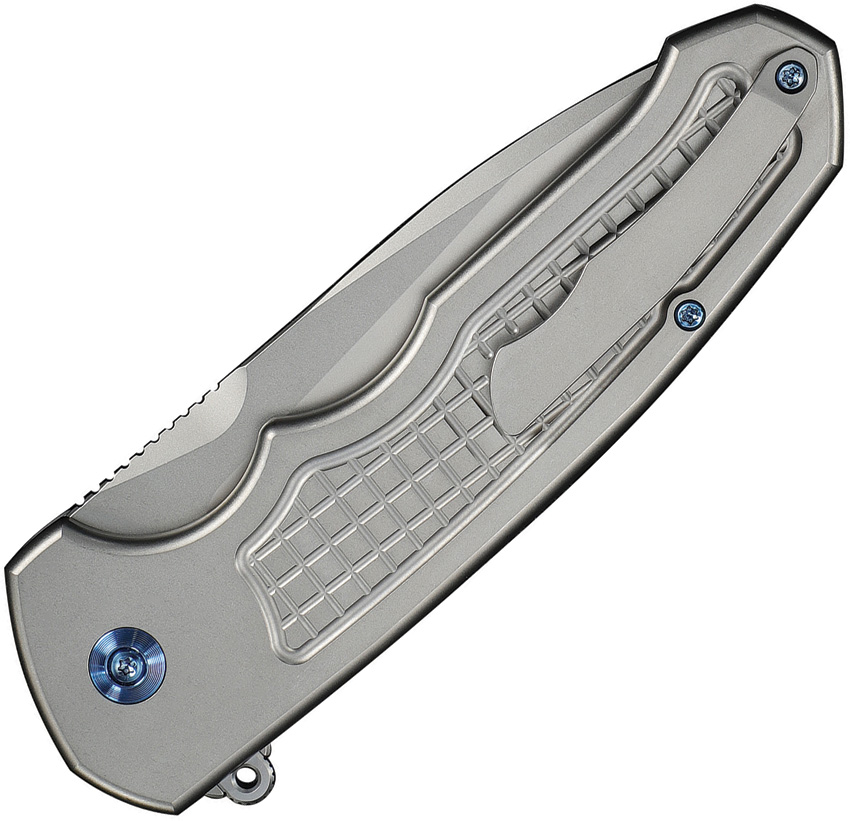 5.38″ (13.67cm) closed. 4″ (10.16cm) stonewash finish Bohler M390 stainless drop point blade. Gray frag pattern titanium handle. Extended tang. Pocket clip. Black nylon zippered storage case. Boxed.