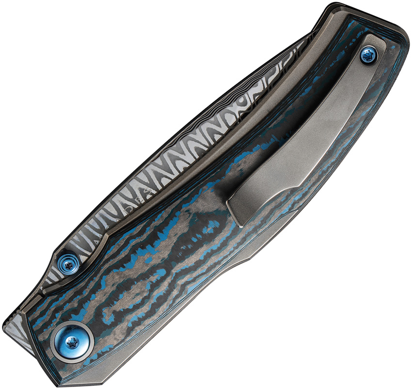 4.38″ (11.13cm) closed. 3.25″ (8.26cm) Damascus steel tanto blade. Gray titanium handle with Arctic Storm Fat carbon fiber onlay. Thumb stud. Extended tang. Pocket clip. Black nylon zippered storage case. Boxed.
