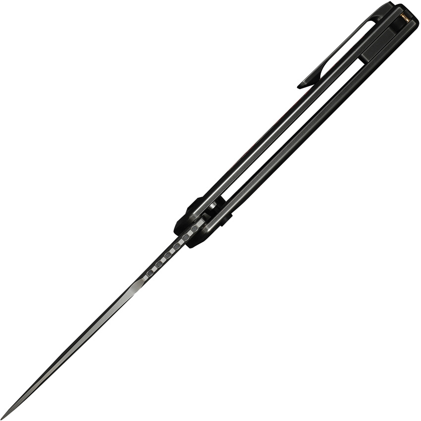 5″ (12.7cm) closed. 3.88″ (9.86cm) Gray polished Bohler M390 stainless drop point blade. Gray titanium handle with Lava Flow Fat carbon fiber inlay. Extended tang. Pocket clip. Black nylon zippered storage case. Boxed.