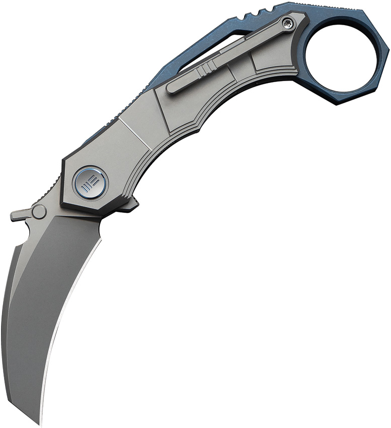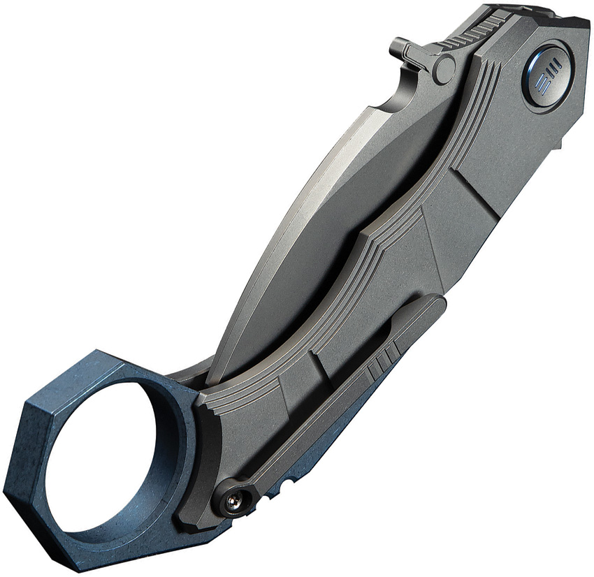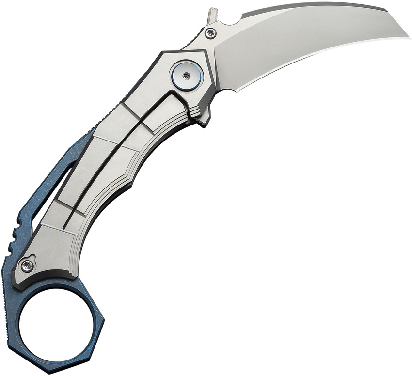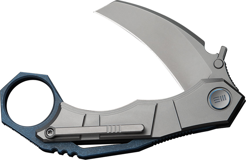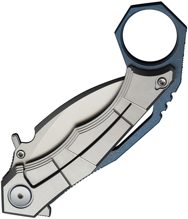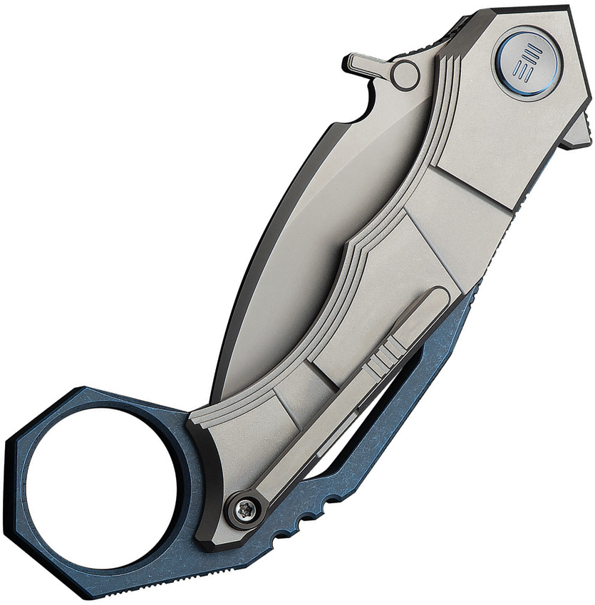 4.75″ (12.07cm) closed. 2.25″ (5.72cm) stonewash finish Bohler M390 stainless hawkbill blade. Blue and gray titanium handle. Thumb stud. Finger ring. Extended tang. Pocket clip. Boxed.