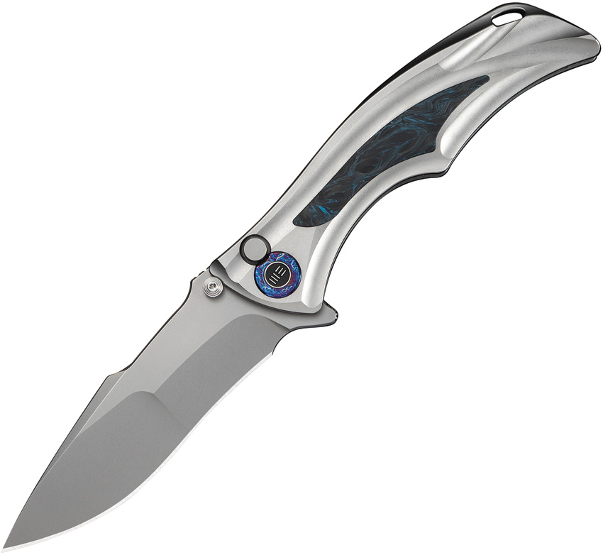 5.13″ (13.03cm) closed. 4″ (10.16cm) stonewash finish Bohler M390 stainless drop point blade. Gray titanium handle with Black and blue carbon fiber inlay. Extended tang. Pocket clip. Thumb stud. Lanyard hole. Black nylon zippered storage case. Designed by Brian Tighe. Boxed.