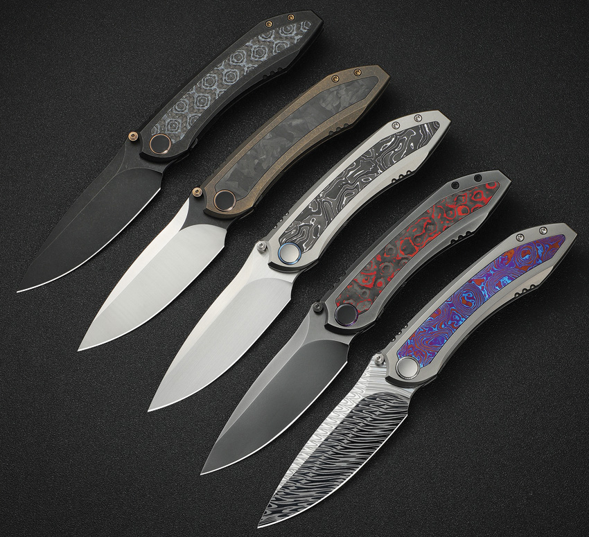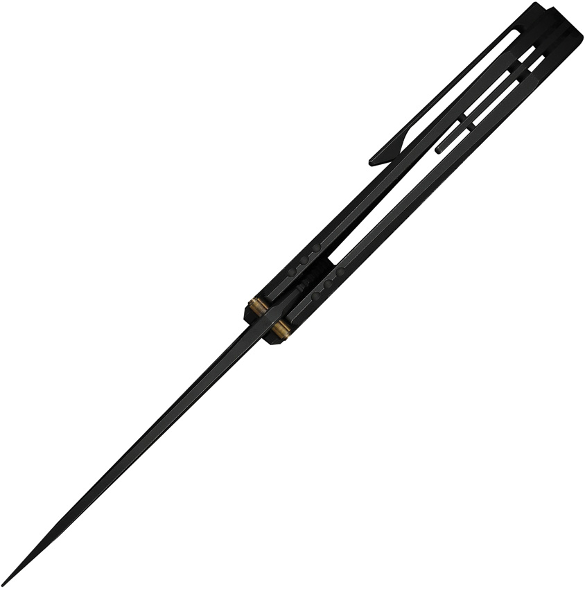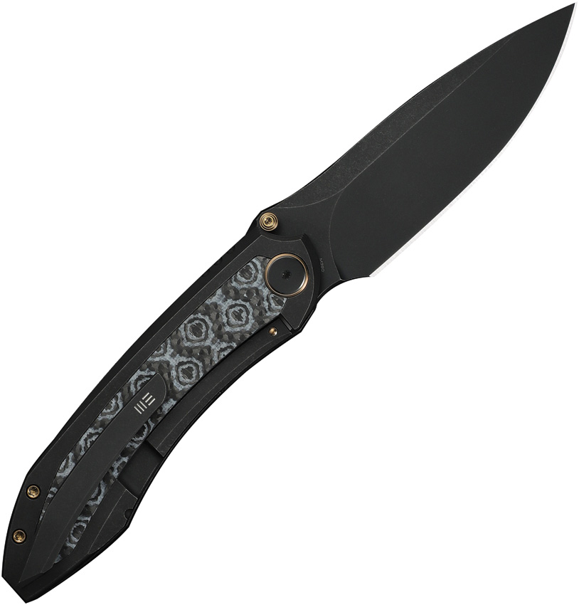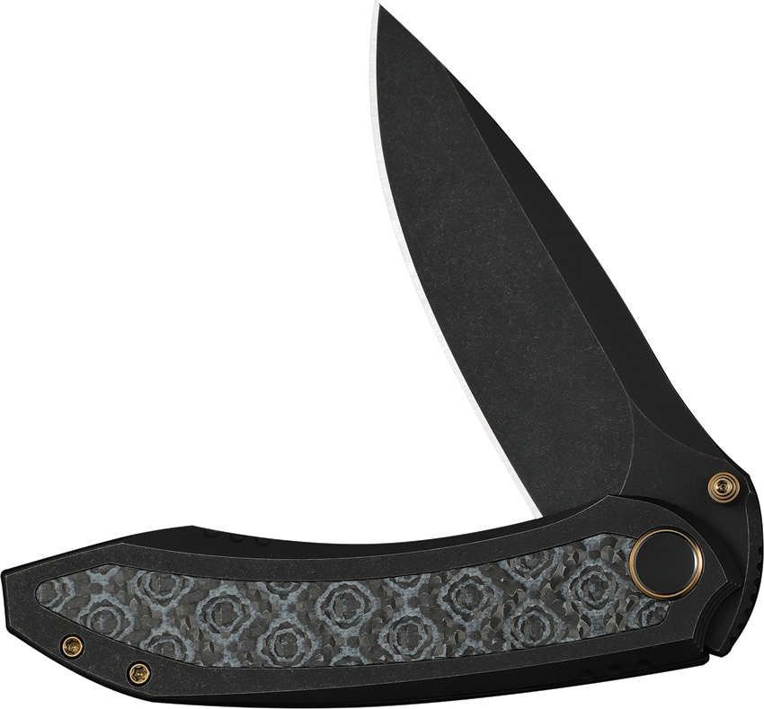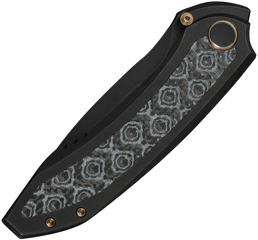 5″ (12.7cm) closed. 3.75″ (9.53cm) black stonewash finish Bohler M390 stainless drop point blade. Black titanium handle with Rose carbon fiber inlay. Thumb stud. Pocket clip. Extended tang. Black nylon zippered storage case. Boxed.