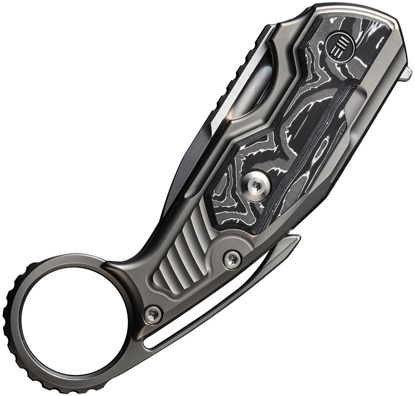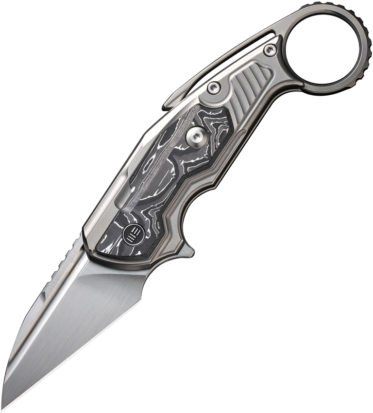 5.13″” (13.03cm) closed. 2.38″” (6.05cm) satin finish CPM-20CV stainless blade. Bead blast finish titanium handle with Aluminum foil carbon fiber inlay. Extended tang. Finger ring. Pocket clip. Black nylon zippered storage case. Boxed.