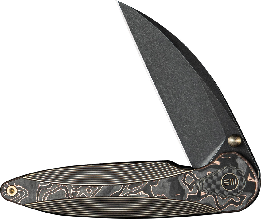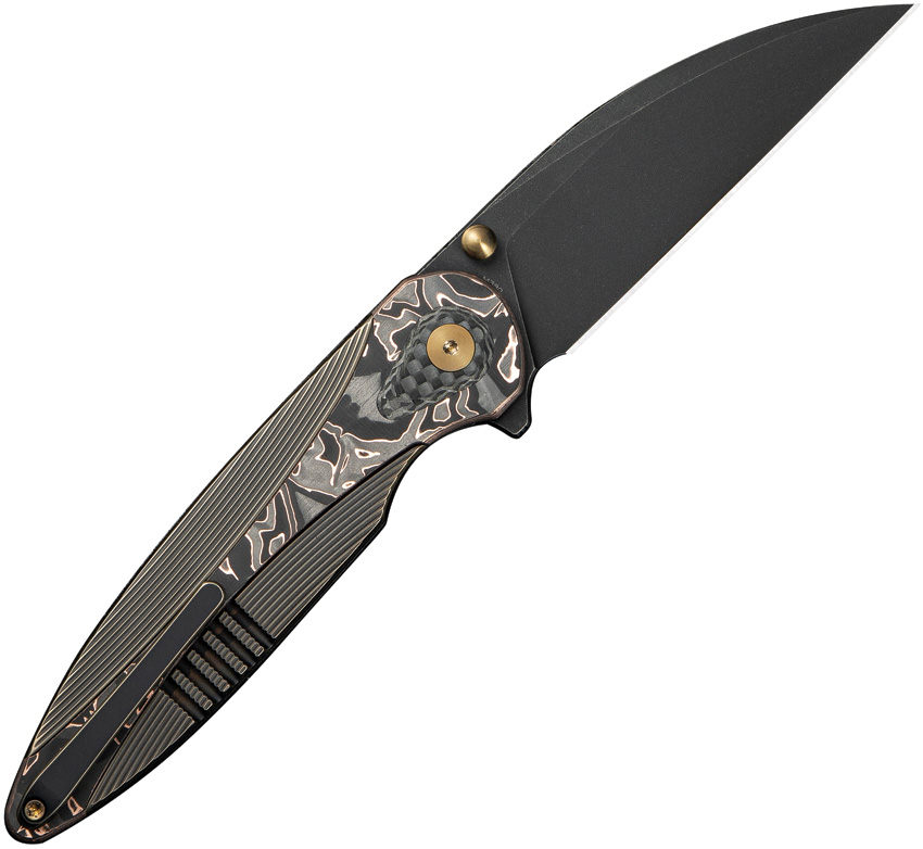 4.63″ (11.76cm) closed. 3.38″ (8.59cm) black stonewash finish Bohler M390 stainless Wharncliffe blade. Bronze titanium handle with Copper foil carbon fiber inlay. Extended tang. Thumb stud. Pocket clip. Black nylon zippered storage case. Boxed.