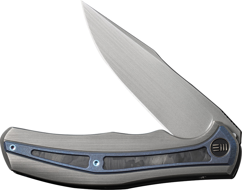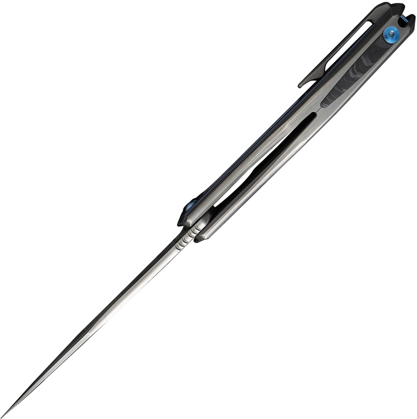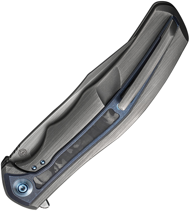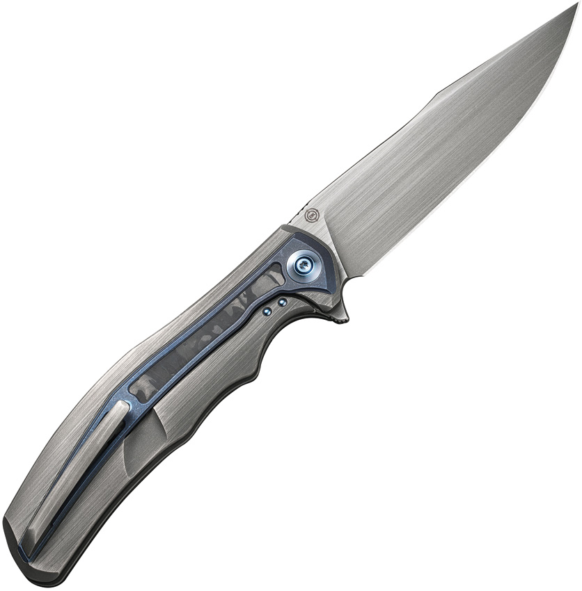 4.88″ (12.4cm) closed. 4″ (10.16cm) CPM-20CV stainless blade. Hand rubbed titanium handle with Blue titanium and marble carbon fiber inlay. Extended tang. Pocket clip. Hand rubbed finish blade. Black nylon zippered storage case. Boxed.