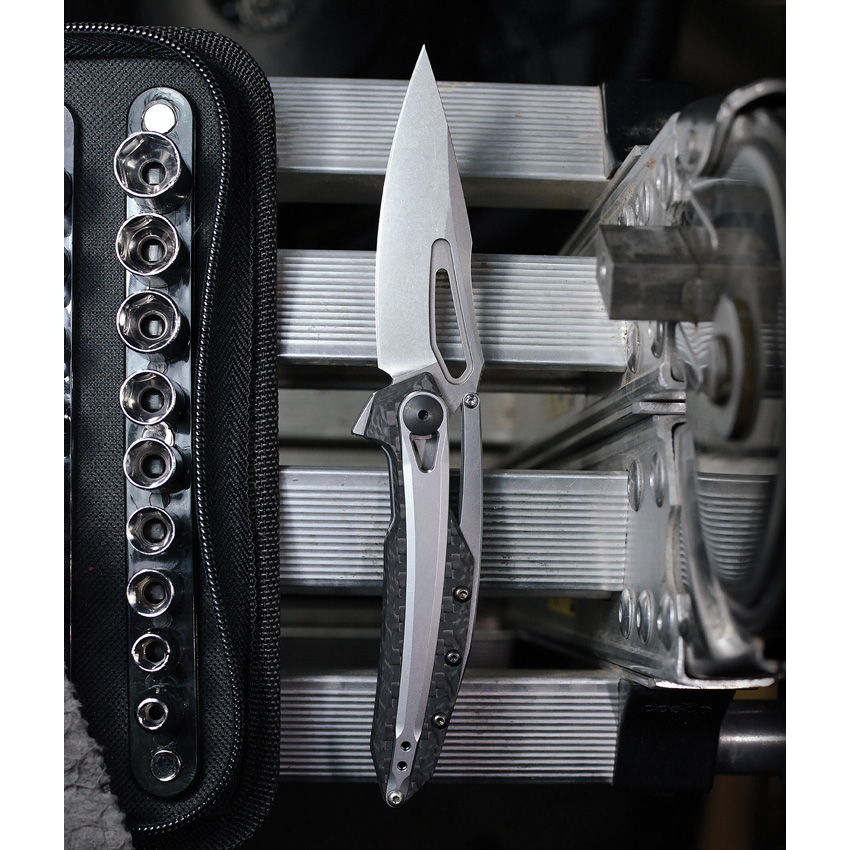 4.5″ (11.43cm) closed. 3.25″ (8.26cm) stonewash finish CPM-20CV stainless spear point blade. Carbon fiber handle. Extended tang. Thumb pull. Pocket clip. KVT ball-bearing opening. Boxed.